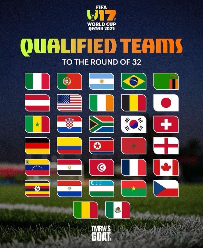 北京时间11月12日,U17男足世界杯小组赛结束,小组赛参赛资格的32支球队全部揭晓。朝鲜、日本、韩国这三个东亚国家在一起。其中,B组日本队以2胜1平保持不败,击败葡萄牙以小组头名出线。韩国队同样2胜1平,排名F组第二。朝鲜队则取得1胜1平1负的战绩。在G组排名第三后,以八组第三名的成绩出线。途经亚洲的球队是来自中亚的乌兹别克斯坦队。他们以2胜1负积6分晋级J组第二名。至于其他五支亚洲参赛球队,包括东道主卡塔尔、沙特阿拉伯、印度尼西亚、阿联酋和塔吉克斯坦均被小组淘汰。世界杯32强名单公布后,1/16决赛的对阵是也是官方定义的。 U17世界杯的规则比较特殊。根据小组赛成绩抽出每组第一、第二和表现最好的8支第三名球队,然后决出淘汰赛。阿根廷与奥地利、意大利、美国同积9分,但以净胜球优势成为头号种子。亚洲四支顶级球队全部位于下半区。具体对阵如下: 【上半场】阿根廷vs墨西哥 葡萄牙vs比利时 瑞士vs埃及 爱尔兰vs加拿大 美国vs摩洛哥 赞比亚vs马里 巴西vs巴拉圭 法国vs哥伦比亚 【下半场】奥地利vs南非vs芬兰 委内瑞拉 克罗地亚vs乌兹别克斯坦 塞内加尔vs乌干达 德国vs布基纳法索